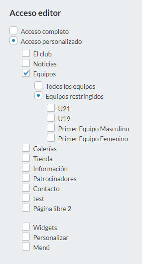 Por defecto, un editor tendrá acceso al sitio completo. Puede elegir la opción “Acceso personalizado” para configurar los accesos específicos. En este caso, aparecerá la lista de secciones disponibles para que escoja las secciones donde el editor tendrá acceso. Si elije la sección “Equipos”, entonces podrá elegir entre dar acceso a todos los equipos o solo a algunos en particular (opción “Equipos restringidos”).