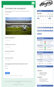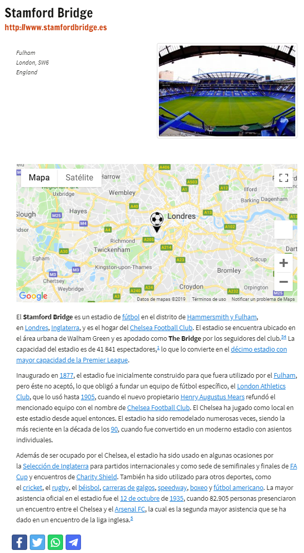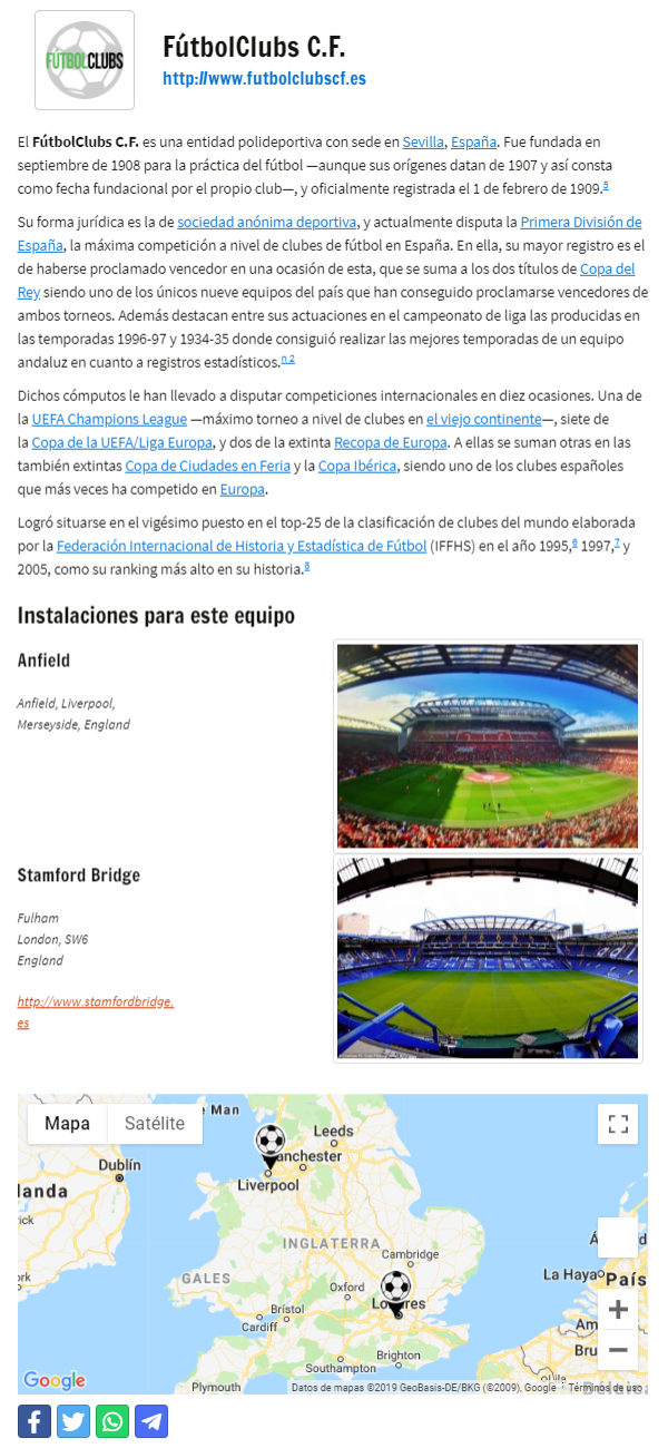 La siguiente ilustración muestra la página correspondiente a esta misma instalación vista desde la web. Esta página será accesible por los visitantes simplemente haciendo clic sobre la ubicación de un partido en los calendarios y/o clasificaciones en los que aparezca.