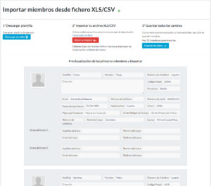 Dentro de la sección “Miembros” del menú de la izquierda, la entrada “Importar miembros” le permitirá importar automáticamente una base de datos de personas (y sus datos) ubicada en un archivo Excel (.xls) o en un archivo CSV.