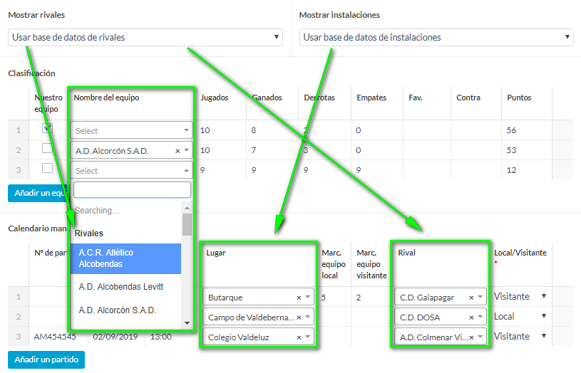 Justo debajo de esta información, también podrá seleccionar la instalación deportiva donde juega el rival. Esta instalación deportiva estará ubicada dentro de la base de datos de instalaciones. Puede seleccionar tantos como necesite.