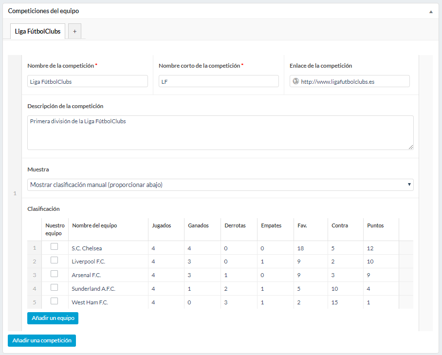 Esta base de datos se puede utilizar para administrar las competiciones de cada uno de sus equipos, como se detalla en la sección “Equipos”. Verá que con esta funcionalidad podrá ahorrar un tiempo valioso en la configuración de los calendarios y clasificaciones de sus equipos.
