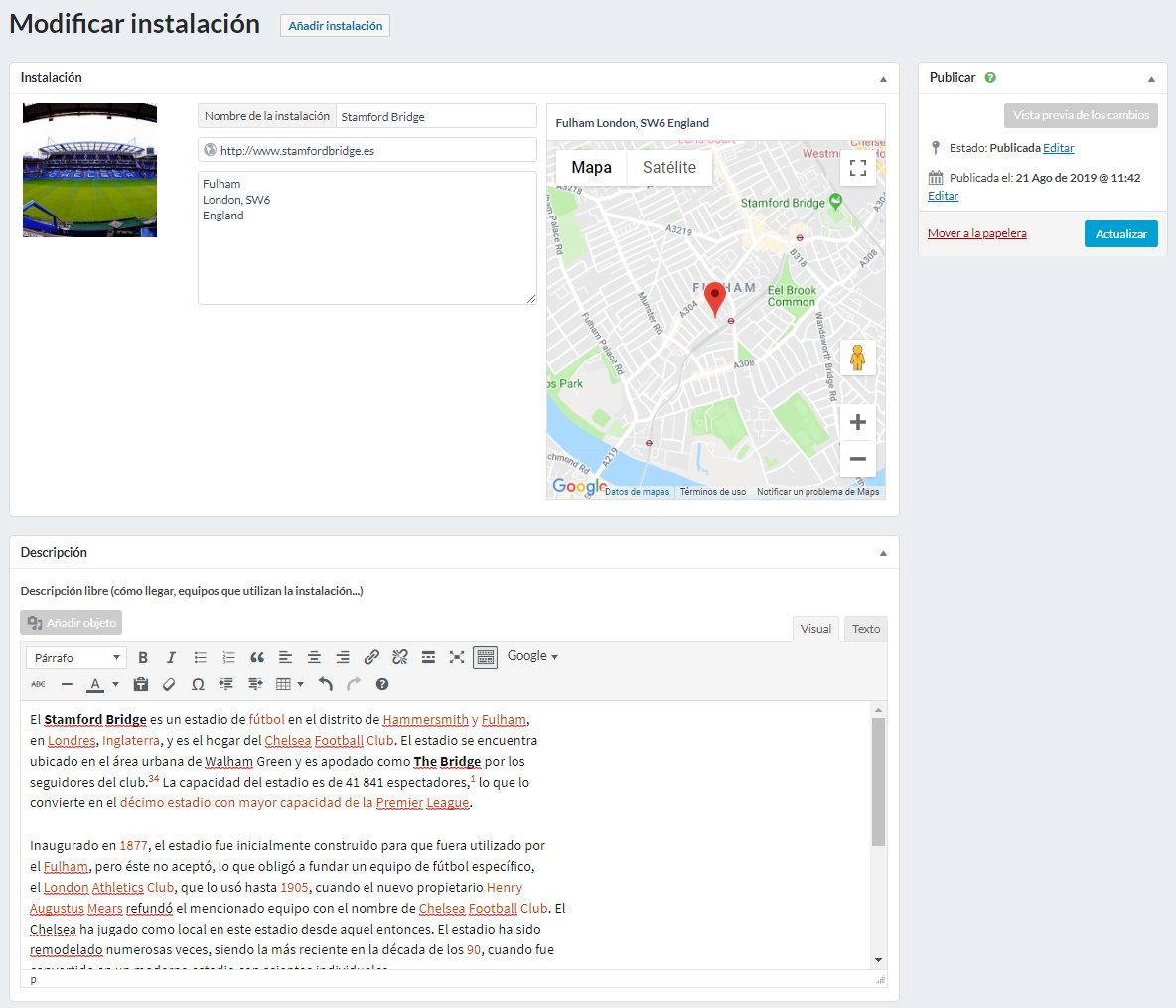 En el cuadro “Instalación” , puede definir la información principal de la instalación deportiva como el nombre, la dirección web, la dirección postal y la localización sobre el mapa de Google Maps.