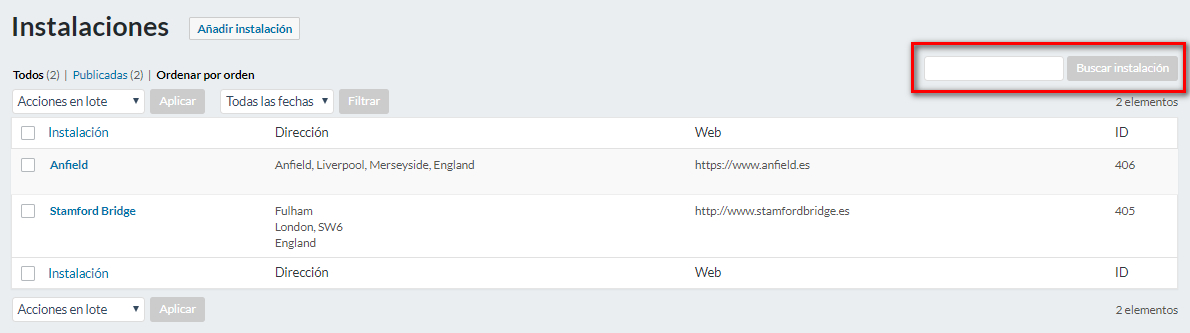 Cuando haya completado todas las fichas, el sumario de instalaciones de su sitio de administración recogerá la información principal de cada instalación (ver imagen de abajo). Gracias al campo que se encuentra en el lado derecho de la lista, podrá buscar una instalación por su nombre haciendo clic posteriormente en “Buscar instalación“.