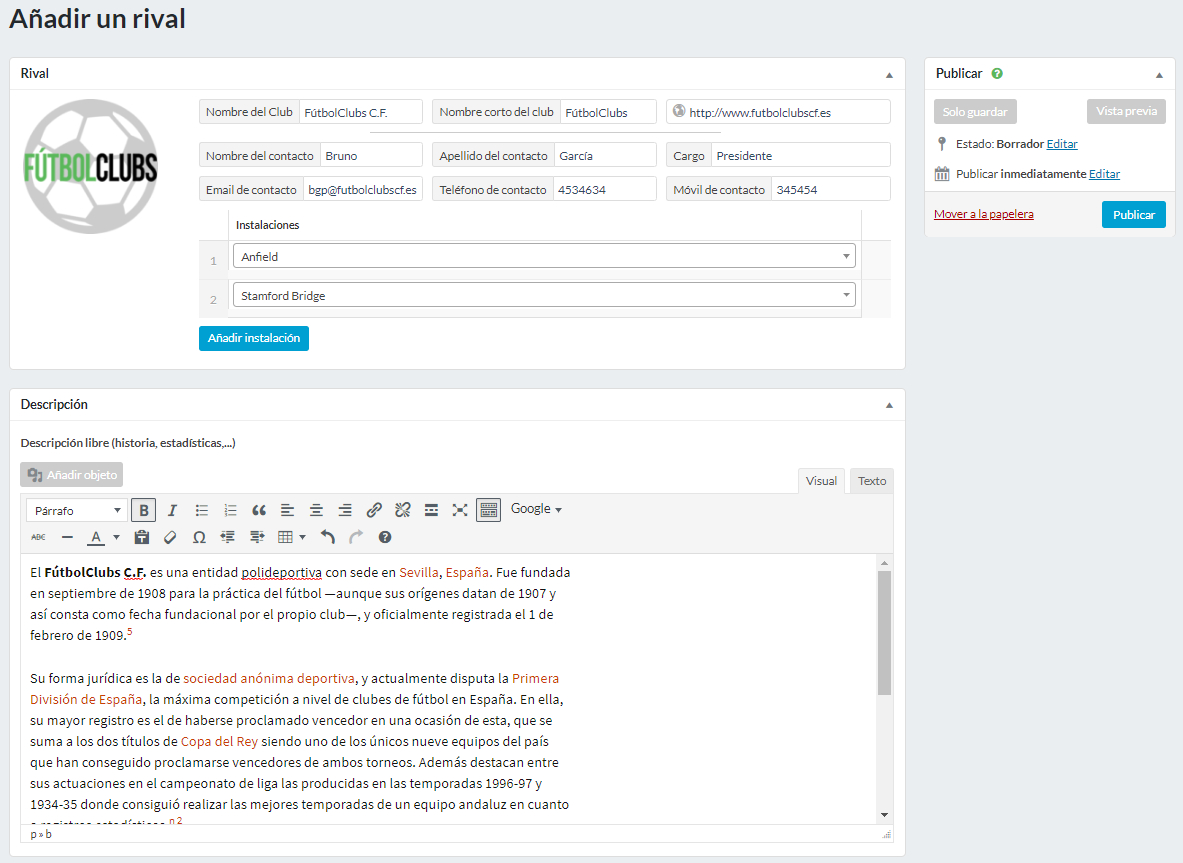 A continuación, en el cuadro titulado “Descripción” podrá aportar una descripción del rival. Este cuadro se rellena haciendo uso del editor de texto (explicado en la sección “Editor de texto“). Por ejemplo, podrá utilizar este campo para añadir los resultados históricos contra este club, los resultados recientes, las estadísticas del rival o su palmarés.