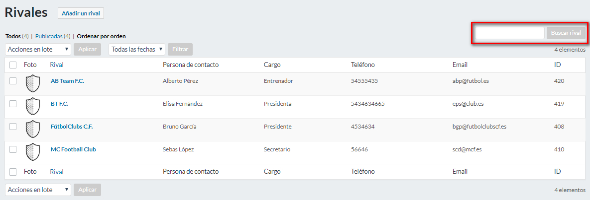 Cuando haya completado todas las fichas, el sumario de rivales de su sitio de administración recogerá la información principal de cada rival (ver imagen de abajo). Gracias al campo que se encuentra en el lado derecho de la lista, podrá buscar un rival por su nombre haciendo clic posteriormente en “Buscar rival“.
