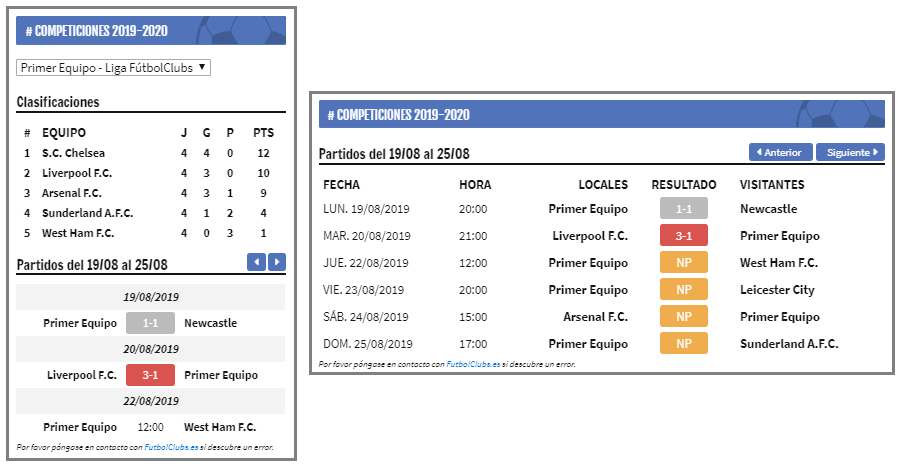 La siguiente ilustración muestra la página correspondiente a este mismo rival vista desde la web. Esta página será accesible por los visitantes simplemente haciendo clic sobre el nombre del rival en los calendarios y/o clasificaciones en los que aparezca.