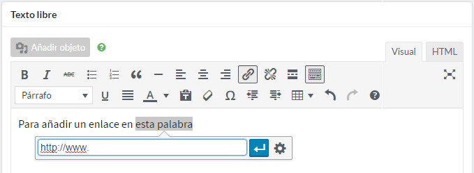 link Este botón le permite, después de haber seleccionado un texto, aplicar un enlace hacia un sitio de Internet o de su propio sitio web: