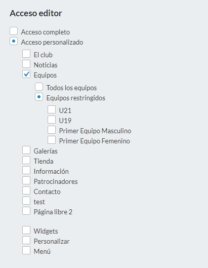 Por defecto, un editor tendrá acceso al sitio completo. Puede elegir la opción “Acceso personalizado” para configurar los accesos específicos. En este caso, aparecerá la lista de secciones disponibles para que escoja las secciones donde el editor tendrá acceso. Si elije la sección “Equipos”, entonces podrá elegir entre dar acceso a todos los equipos o solo a algunos en particular (opción “Equipos restringidos”).