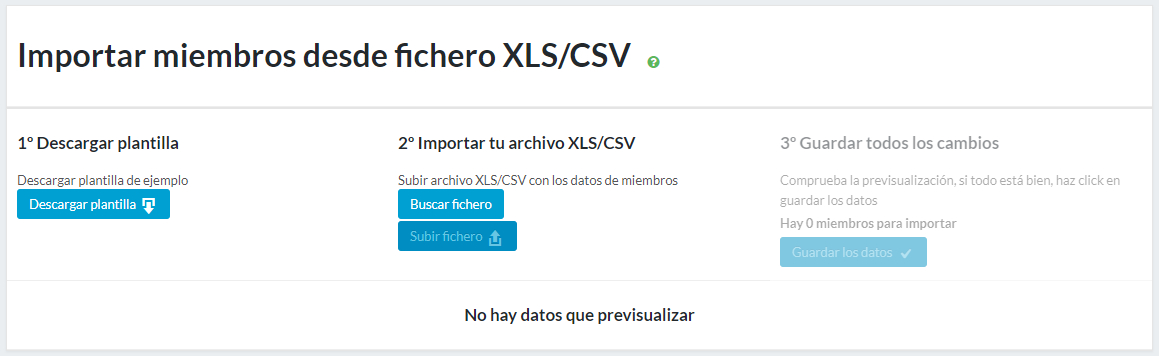 Dentro de la sección “Miembros” del menú de la izquierda, la entrada “Importar miembros” le permitirá importar automáticamente una base de datos de personas (y sus datos) ubicada en un archivo Excel (.xls) o en un archivo CSV.