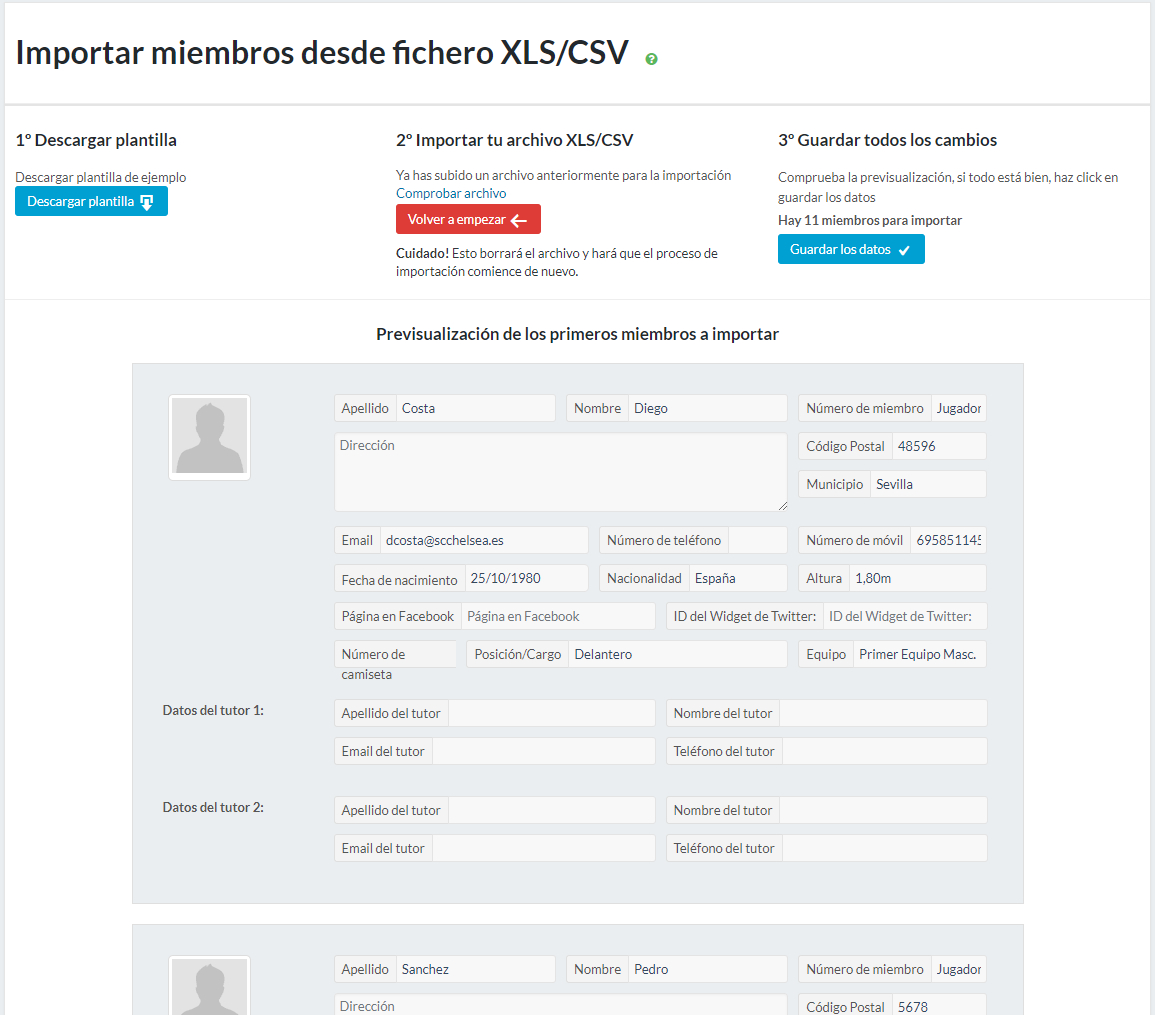 La segunda etapa trata de importar el archivo completo con los datos de sus miembros y de asegurar que todo está correcto. Primero, presiona el botón “Buscar fichero” para buscar el archivo en su ordenador. A continuación, haz clic en “Subir fichero” y espera a que el sistema los analice.