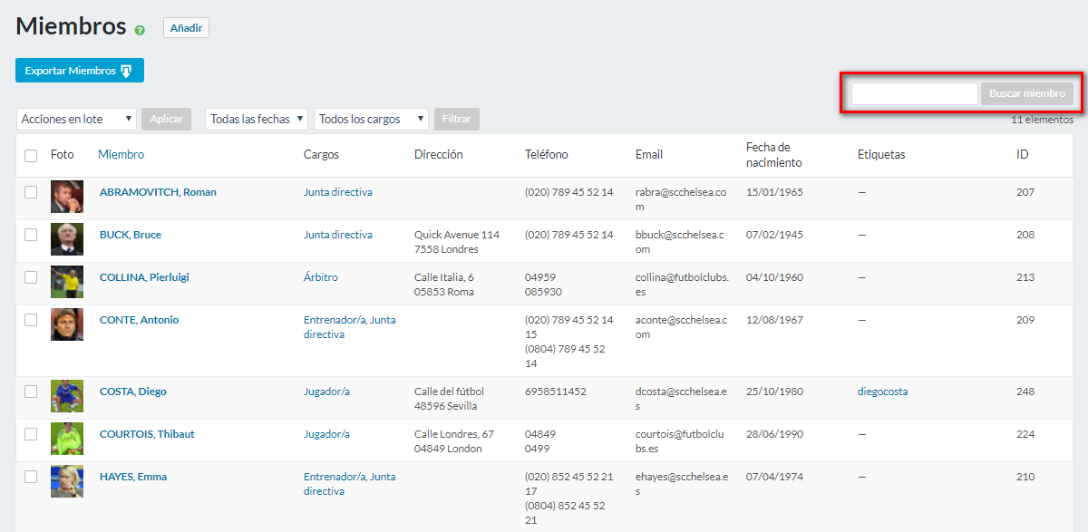 La gestión de los/as miembros, disponible únicamente en la tarifa Premium, constituye la base de datos de los/as miembros de su club. Ésta permite crear una « ficha de miembro » para cada persona del club (junta directiva, entrenadores/as, jugadores/as, etc.) con todos los datos personales de cada una de ellas.