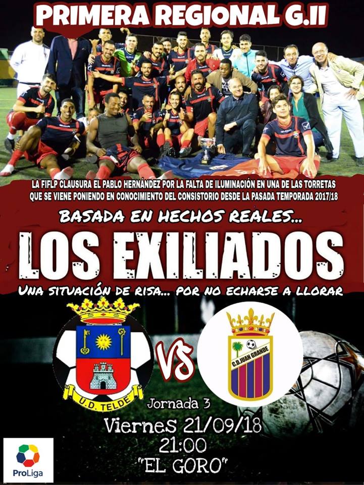 CARTEL PROMOCIONAL REGIONAL SIN FILTROS ?❤??? Como este año no queremos que nada nos borre la sonrisa, hemos estrenado una película de risa escrita y dirigida por La concejalía de Deportes de Telde y protagonizada por nuestro regional ??? LOS EXILIADOS cuenta la historia de un club que se ve obligado a jugar fuera de su campo por la clausura del mismo debido al lamentable estado de la instalación... destacando uno de los focos con tan poca iluminación (solo un bombillo?) que se podría rodar una película de terror en la oscuridad. Si eres de los que te gusta el cine, ven al estreno de nuestra superproducción de bajo coste.. MAÑANA 21:00 EN EL ESTADIO DEL GORO jugamos "EN CASA", en el exilio de nuestro nuevo hogar ?? Poniendonos serios, pedimos disculpa a socios y aficionados afectados por este cambio pero jugadores y cuerpo técnico del regional se niegan a jugar los sabados por la tarde ya que consideran que ya es un esfuerzo personal y familiar entrenar 3 días a la semana compaginandolo con sus trabajos y vida privada como para encima sacrificar los pocos días libres que pueden dedicarle a los suyos... por ese motivo el club ha decidido buscar solución al problema (ya que la verdadera solución esta en manos de nuestro ayuntamiento) y "exiliarnos" al Goro hasta que el Pablo Hernández esté en condiciones de acoger un partido de fútbol. PD: TENGAN HUMOR AMIG@S QUE SOLO SE VIVE UNA VEZ ?❤?