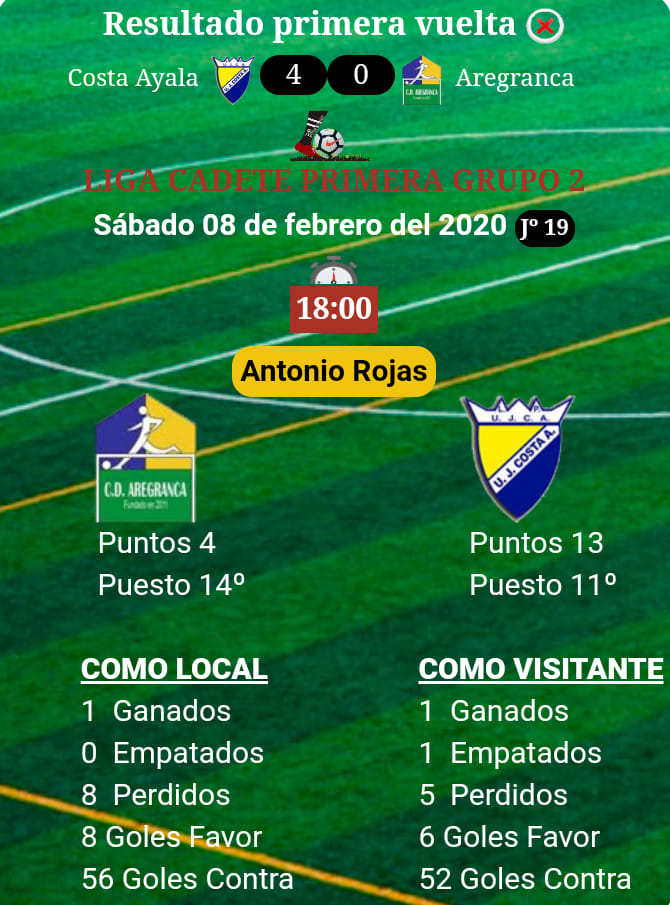 Decimo noveno encuentro de la temporada 19/20. 8 febrero, 2020Últimas noticias Decimo noveno encuentro de la temporada 19/20. Sábado 08/02/2020 a las 18:00 horas se celebrará en El Antonio Rojas Con tu apoyo obtendremos la victoria ¡TE ESPERAMOS! ⚽⚽⚽